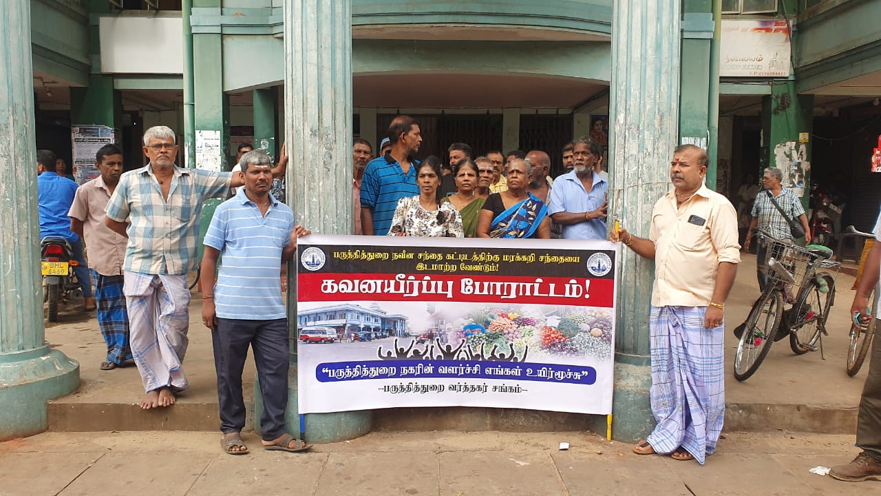 பருத்தித்துறை வர்த்தக சங்கத்தினர் மற்றும் மரக்கறி சந்தை வியாபாரிகள் இணைந்து பருத்தித்துறை நகரில் இன்றைய தினம் வெள்ளிக்கிழமை கவனயீர்ப்பு போராட்டத்தை முன்னெடுத்தனர்நகரின் மையப் பகுதியில் அமைந்திருந்த மரக்கறிச் சந்தையை , மீன் சந்தை வீதியில் புதிதாக கட்டடம் ஒன்றை நிர்மாணித்து அங்கு வியாபாரிகளை பருத்தித்துறை நகரசபை செயலாளர் தலைமையில் மாற்றம் செய்து வைக்கப்பட்டது.குறித்த புதிய சந்தைக் கட்டடம் போதிய இடவசதிகள் இல்லை எனவும் மழை நேரங்களில் வெள்ளம் தேங்கி நிற்ப்பதாகவும், அதனால் வியாபார நடவடிக்கைகள் பாதிக்கப்பட்டுள்ளதாக மரக்கறி வியாபாரிகள் நகரசபை தவிசாளர் உள்ளிட்டோரிடம் மகஜர்களை கையளித்திருந்தனர்.அது தொடர்பில் நகரசபை அமர்வின் போது நிபுனர்குழு ஒன்று உருவாக்கப்பட்டு ஆராய்ந்து முடுவெடுப்பதாக தீர்மானம் நிறைவேற்றப்பட்டிருந்தது.இருந்த போதிலும் இதுவரை தமது கோரிக்கைகள் நிறைவேற்றுப்படவில்லை என மரக்கறி வியாபாரிகள் மற்றும் வர்த்தகர்கள் இணைந்து போராட்டத்தை முன்னெடுத்தனர்.