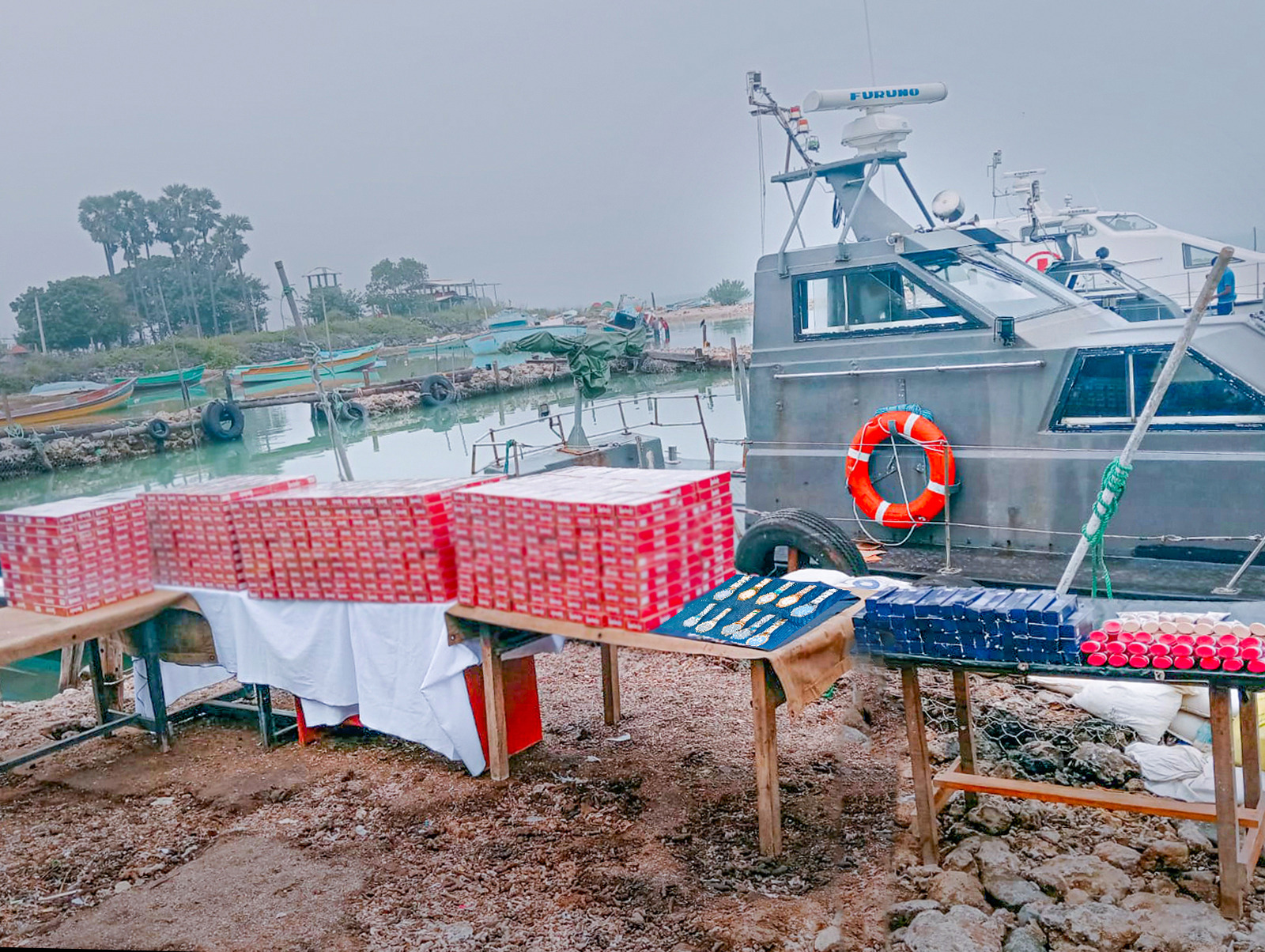 நெடுந்தீவு கடலில் மிதந்து வந்த வெளிநாட்டு சிகரெட்டுகள் மற்றும் அழகுசாதன பொருட்கள்
