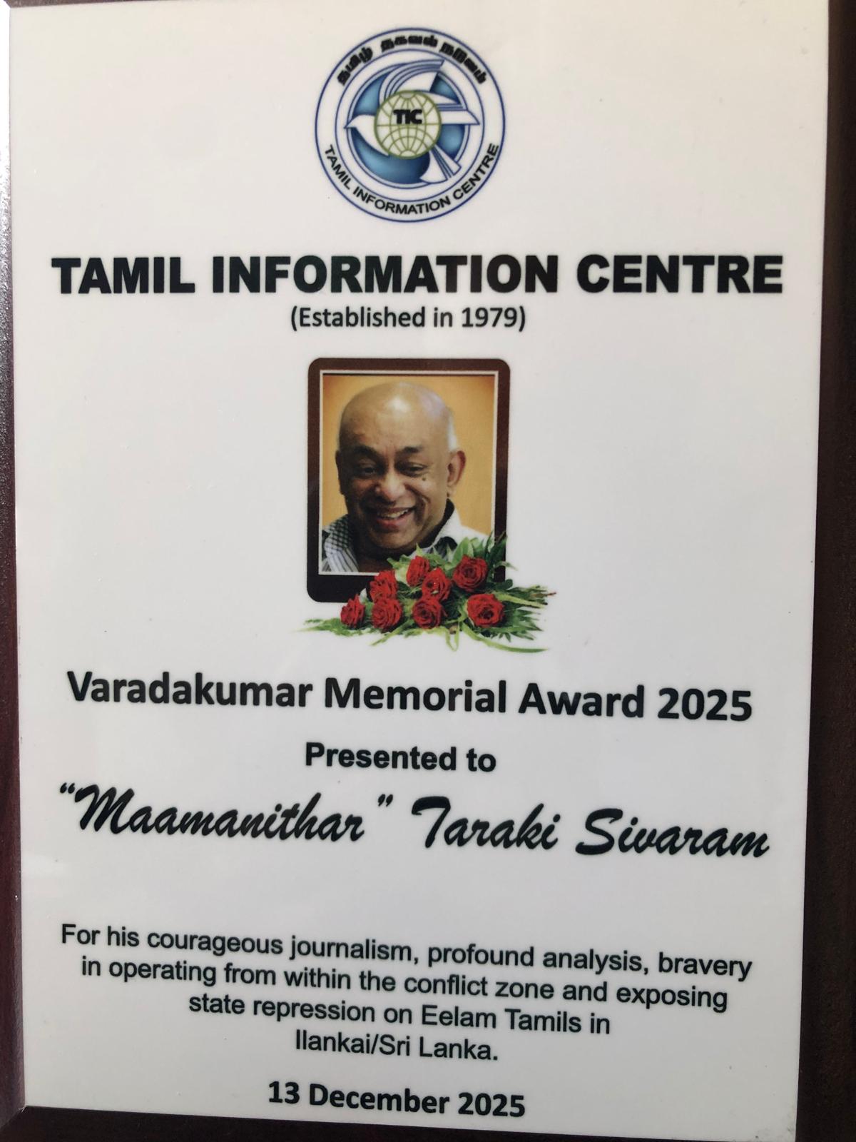 தாரகி அல்லது தராக்கி என்று பரவலாக அறியப்பட்ட மாமனிதர் தர்மரட்ணம் சிவராம் அவர்களின் துணிகரமான பத்திரிகைச் செயற்பாட்டுக்காக பிரித்தானியாவில் அவருக்கு வரதகுமார் நினைவு விருது வழங்கப்பட்டுள்ளது. மாமனிதர் சிவராமின் ஆழமான பகுப்பாய்வுக்கும், தாயகத்தின் நெருக்கடியான போர்ச் சூழலில் அவர் செயலாற்றிய வீரத்துக்குத் தலைவணங்கியும் இலங்கையில் நடந்தேறும் அரச ஒடுக்குமுறையை உலகுக்கு அம்பலப்படுத்திய செயற்பாட்டுக்குமாக வரதகுமார் நினைவு விருது இலண்டனில் 2025 டிசம்பர் 13 ஆம் நாள் சனியன்று வழங்கப்பட்டுள்ளது. 1979 ஆம் ஆண்டு ஆரம்பிக்கப்பட்டதில் இருந்து முதலில் தமிழ்நாட்டை மையமாகக் கொண்டும் பின்னர் பிரித்தானியாவை மையமாகக் கொண்டும் ஈழத்தமிழர் அரசியல், மரபியல், மனித உரிமை ஆகிய விடயதானங்களை தரவுப்படுத்துவதில் தமிழ் தகவல் நடுவம் (Tamil Information Centre, TIC) என்ற அமைப்பு தொடர்ச்சியாக இயங்கிவருகிறது. யாழ்ப்பாணத்தில் இருந்து ஈழத்தமிழரிடையே சுதந்திரன் என்ற பத்திரிகை இயங்கியதற்குச் சமாந்தரமாக, ஆனால் கட்சிசார்பற்ற சுயாதீன ஆங்கில வாராந்தப் பத்திரிகையாக சற்றர்டே றிவியூ இயங்கிவந்தபோது அதன் ஆசிரியராக மறைந்த மூத்த பத்திரிகையாசிரியான எஸ். சிவநாயகம் பணியாற்றியிருந்தார். அவர் தமிழ் தகவல் நடுவத்தில் இணைந்து பிற்காலத்தில் காத்திரமான தரவுப்படுத்தும் பணிகளை மேற்கொண்டிருந்த போது அவரோடு நெருக்கமாகப் பணியாற்றிய வைரமுத்து வரதகுமார் (1949-2019) நடுவத்தின் பணிகளை அதன் முழுநேரச் செயற்பாட்டாளராகவும் வாழ்நாட் செயற்பாட்டளராகவும் தொடர்ச்சியாக மேற்கொண்டுவந்தார். அத்தகைய பாரம்பரியம் கொண்ட தமிழ் தகவல் நடுவத்தால் ஆண்டுதோறும் மனித உரிமை நாளை ஒட்டி வரதகுமார் நினைவு விருது வழங்கப்பட்டுவருகிறது. பிரித்தானியாவில் இருந்து இயங்கும் அந்நாட்டைச் சேர்ந்த ஒரு வழக்கறிஞரான போல் ஹெரன் என்பவருக்கும் இரண்டாம் தலை முறை ஈழத்தமிழர் வழக்கறிஞையான சாந்தி சிவகுமாரனுக்கும் 2025 ஆம் ஆண்டுக்கான மனித உரிமை விருது வழங்கப்பட்டது. பிரித்தானியாவில் ஈழத்தமிழர்களை அச்சுறுத்தும் வகையில் செயற்பட்ட இலங்கைத் தூதரலாயத்தில் கடமையாற்றிய முன்னாள் இராணுவ அதிகாரி ஒருவருக்கெதிரான சட்ட நடவடிக்கை உள்ளடங்கலாக பல சட்ட நடவடிக்கைகளில் இவர்கள் ஈடுபட்டிருந்தமைக்கான அங்கீகாரமாக மனித உரிமை விருதுகள் வழங்கப்பட்டன. மாமனிதர் சிவராமுக்கான சிறப்பு விருதை அவரின் மனைவி பிள்ளைகளிடம் சேர்க்கும் முகமாக தமிழ்நெட் ஆங்கில ஊடகத்தின் நிறுவக ஆசிரியரும் சிவராமின் நெருங்கிய ஊடக நண்பருமான ஜெயா கோபிநாத் (நோர்வே) பெற்றுக்கொண்டு சுருக்கமான நினைவுரை ஒன்றையும் நிகழ்வில் வழங்கியிருந்தார். தனது 