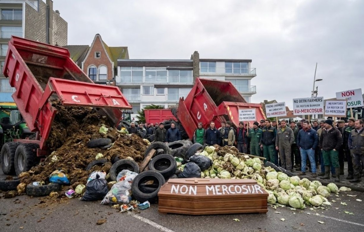 மெர்கோசூர் வர்த்தக ஒப்பந்தம் கையெழுத்தாவது தாமதமானாலும், ஐரோப்பிய ஒன்றியம் அதைக் கைவிட வேண்டும் என்று கோரி, பிரான்ஸ் விவசாயிகள் லு டௌக்கெட்டில் உள்ள ஜனாதிபதி மக்ரோனின் வீட்டிற்கு வெளியே ஆர்ப்பாட்டத்தில் ஈடுபட்டனர்.கடலோர நகரமான லு டௌக்கெட்டில் உள்ள ஜனாதிபதி இம்மானுவேல் மக்ரோனின் இரண்டாவது வீட்டிற்கு வெளியே டஜன் கணக்கான விவசாயிகள் கூடினர். அதிகாலையில் இருந்து சுமார் ஐம்பது பேர் தொழிற்சங்க அழைப்பை ஏற்று, காவல்துறையின் கண்காணிப்பின் கீழ் கடற்கரையில் உளவூர்திகளை நிறுத்தினர்.சில போராட்டக்காரர்கள் முழு டிரெய்லர்களுடன் வந்து, அரசாங்கத்தின் மீது அழுத்தம் கொடுப்பதை நோக்கமாகக் கொண்ட ஒரு அடையாளச் செயலாக, சொத்துக்கு அருகில் பண்ணை கழிவுகளைக் கொட்டினர்.ஐரோப்பிய ஒன்றிய மெர்கோசூர் வர்த்தக ஒப்பந்தத்திற்கு எதிராக பிரஸ்ஸல்ஸில் நடந்த ஆர்ப்பாட்டங்களைத் தொடர்ந்து இந்த போராட்டம் நடைபெற்றது. ஐரோப்பிய ஆணையம் கையெழுத்திடுவதை ஜனவரி வரை தாமதப்படுத்தியிருந்தாலும், இது போதாது என்று தொழிற்சங்கங்கள் கூறி ஒப்பந்தத்தை கைவிட வேண்டும் என்று தொடர்ந்து கோரி வருகின்றன.ஐரோப்பிய ஒன்றிய பண்ணை மானியங்களில் ஏற்படக்கூடிய வெட்டுக்கள் மற்றும் திட்டமிடப்பட்ட காலநிலை நடவடிக்கைகள் செலவுகளை அதிகரிக்கும் என்று அவர்கள் அஞ்சுவதை விவசாயக் குழுக்களும் எதிர்க்கின்றன. விவசாயிகளுக்கு இன்னும் தெளிவான உத்தரவாதங்கள் இல்லை என்று கூறி, லு டௌக்கெட் மேயர் டேனியல் ஃபாஸ்குவெல் பகிரங்கமாக ஆதரவைக் குரல் கொடுத்தார்.